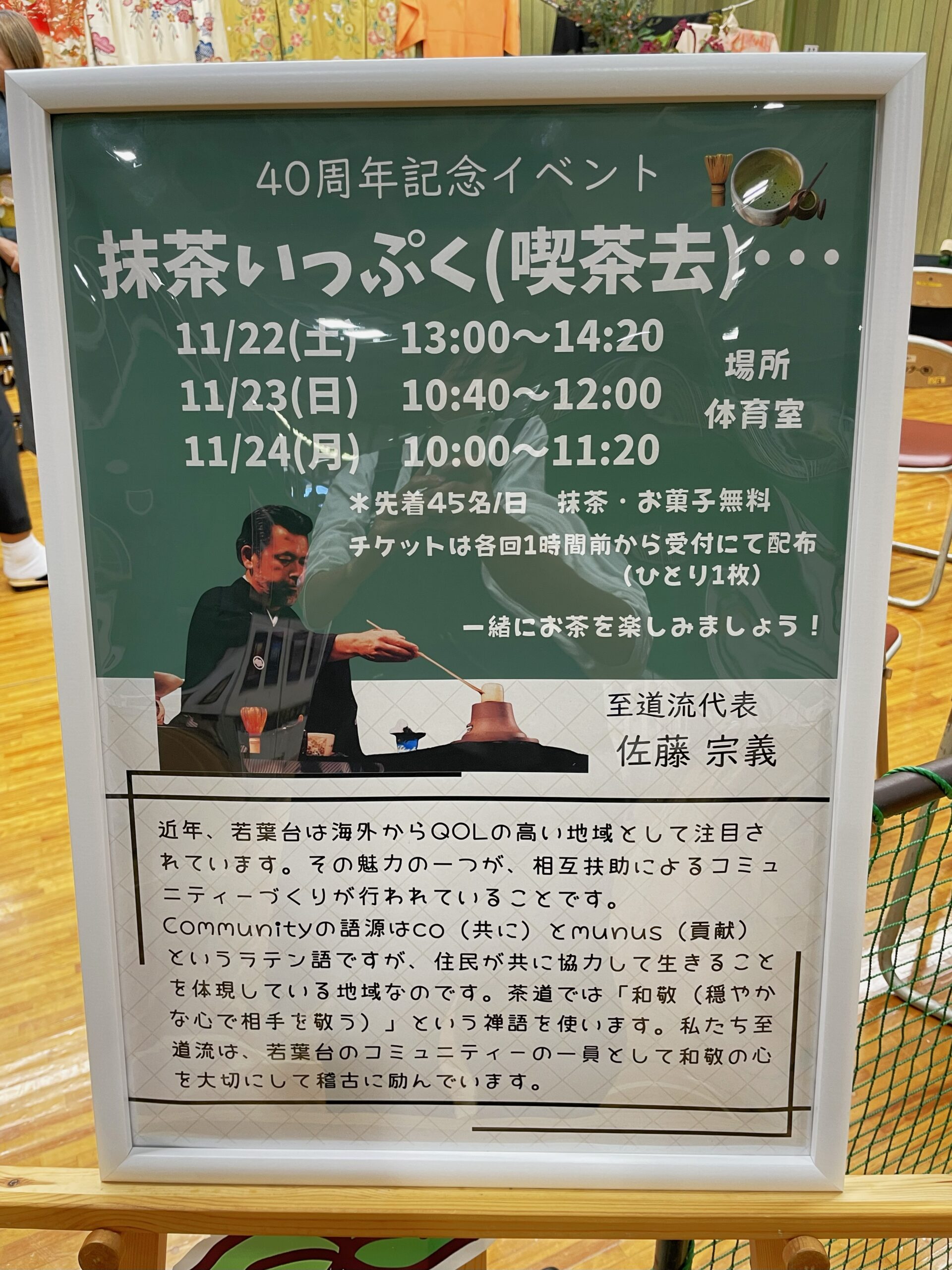2025.11.22 若葉台地域創設40周年記念行事 2025年11月27日 最終更新日時 : 2025年11月27日 佐藤 義勝 私の地元(若葉台)の地域創設40周年記念行事で3日間の席持ちをさせていただきました。 おもてなしは若葉台在住のみなさんで、このイベントのために短期間でチームを作り稽古に励みました。 今後このチームは「なごみ」という茶道クラブで活動を開始するようです。