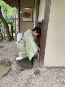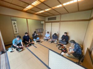 普段は茶室の外で茶庭の手入れを仕事とする職人のみなさんですが、本日は茶室で抹茶を楽しみながら茶庭の景観を楽しんでいらっしゃいました。